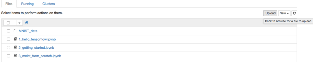 You should then be able to get it started in your instantiation of Tensorflow (tips on installation here) either by popping it into the local folder which you’re syncing with Docker, or, more straightforwardly, by going to Upload on the right hand side of your Jupyter interface:
