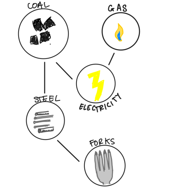 To take a highly simplified example, here’s a graph representing the production of forks. Gas and coal can both be used to make electricity. Coal can also be used to make steel, which is a key material for forks:
