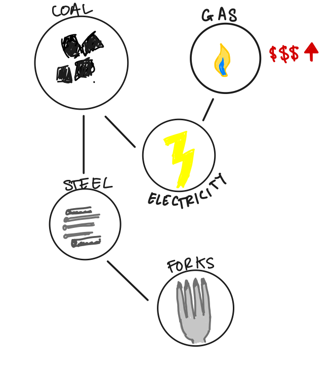We now have a problem, because gas was one of the two ways we had to make electricity. As a result the price of coal, a substitute for gas in electricity production, increases in turn. This directly impacts the cost of steel, and ultimately forks. Even though in this example fork manufacturers have no direct dependence upon gas, the knowledge of the gas price increase has percolated through the economy and is now reflected in a slight increase in the price of forks.