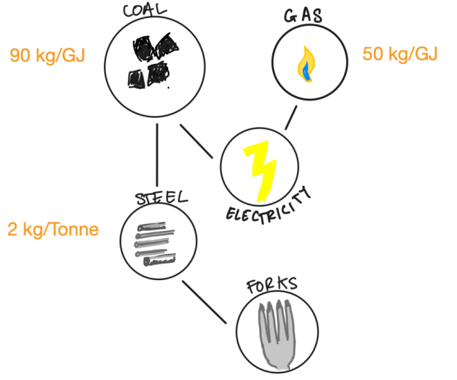 Figures are approximately correct. Note the different units here, which is a common issue. Forks are one of the simplest products you can imagine footprinting, because their footprint is probably dominated by the steel. Imagine trying to draw this diagram for a microwave, or a mobile phone, or a hospital.