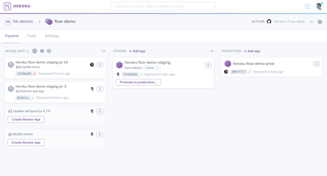 Review apps on Heroku. The boxes on the left correspond to ephemeral deployments created when a Pull Request was opened. Source: Heroku.