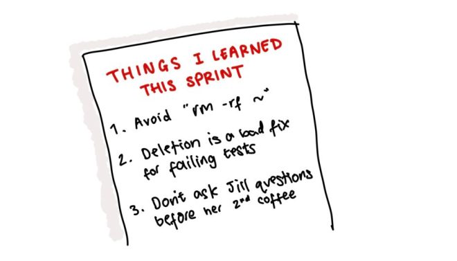 It can be helpful to note down things you learned each sprint. The first of these lessons is a genuine one; a few weeks into a new job I managed to accidentally create a local folder called ~ and then wipe my entire home directory in the course of attempting to delete the directory. Source: author