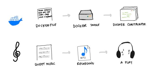 The best analogy I’ve been able to conceive of is musical. Docker starts with a Dockerfile, which is like a piece of sheet music specifying a song. When it’s compiled by Docker, it becomes a Docker Image, which is somewhat like an MP3 of that song. Whenever we want to launch a computing job from the docker image the result is a Docker container, which is a ephemeral (meaning short-lived), consistent (it’s always the same) computing environment that’s specified by the image – in the same way that playing your MP3 produces a short experience that’s exactly the same each time you do it.24