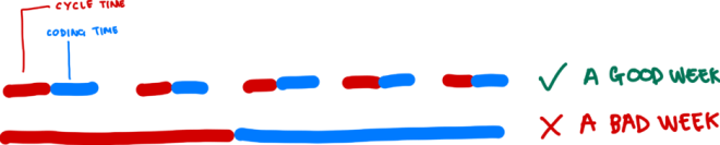 You want to pick up lots of small tasks and execute them quickly. If you struggle with the basics, you’ll be tempted to pick up more complex tasks to compensate for the long cycle time, and finish the week without anything deployed – a bad week. Source: author