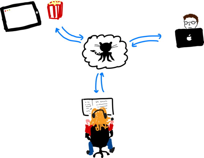 A version control program such as Github (who have this weird octocat character as a mascot, pictured in the centre) allows multiple developers to develop independently, periodically updating the shared copy of the code that lives on the internet. Source: author.