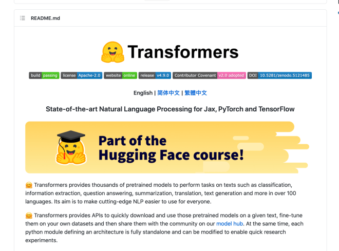 An example README, from https://github.com/huggingface/transformers. If you include a file called README.md at the root of your repository, it’s typically rendered by your version control system when people navigate to the code online, as a user guide. All those brightly coloured badges relate to various build and test statuses for the repo. Source: HuggingFace