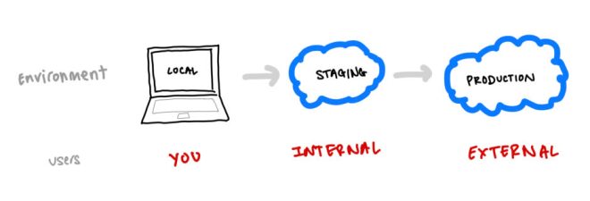 A typical deployment flow. Often staging will be referred to as “dev”, or “development environment”. In some flows, staging is associated with one git branch (often develop) whilst production is associated with another (main or master). Source: author