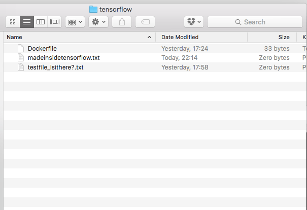 Now create a new file, using the command touch followed by the name of a file (here called madeinsidetensorflow.txt).