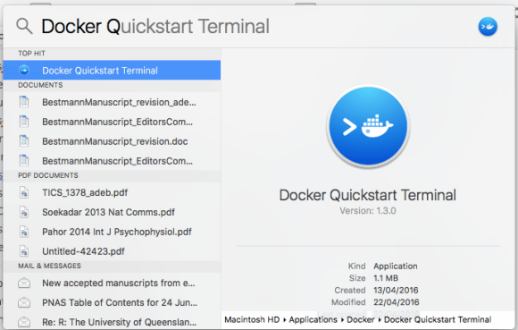 - Open the Docker QuickStart Terminal – easiest way to do this is using Spotlight, hitting Cmd+Spacebar, typing ‘Docker Q’ and hitting enter: