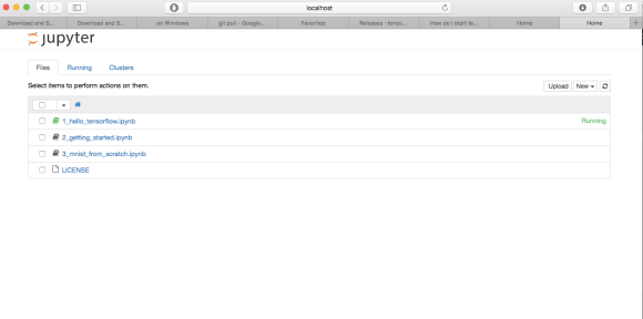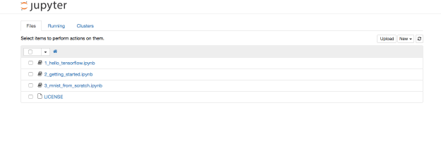 This is the interface for your Jupyter notebooks! Select one of them to get started (probably the one marked 1, hello_tensorflow), and you’ll see a real, live, Python notebook running Tensorflow: