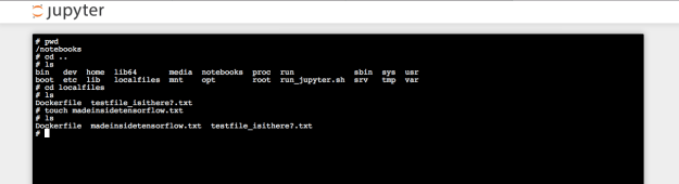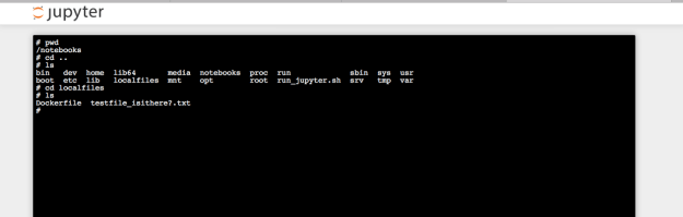Once inside, we can use a unix command (pwd) to figure out where precisely we are. It turns out we are in a folder called notebooks.
