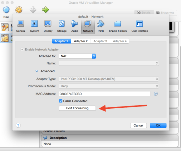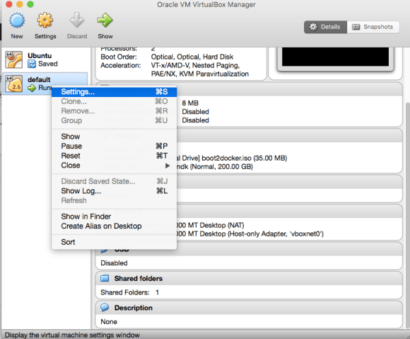 - In VirtualBox you get a little summary of the different virtual machines you have installed via Docker. You will have one, called ‘Default’. Right click on this and select Settings.