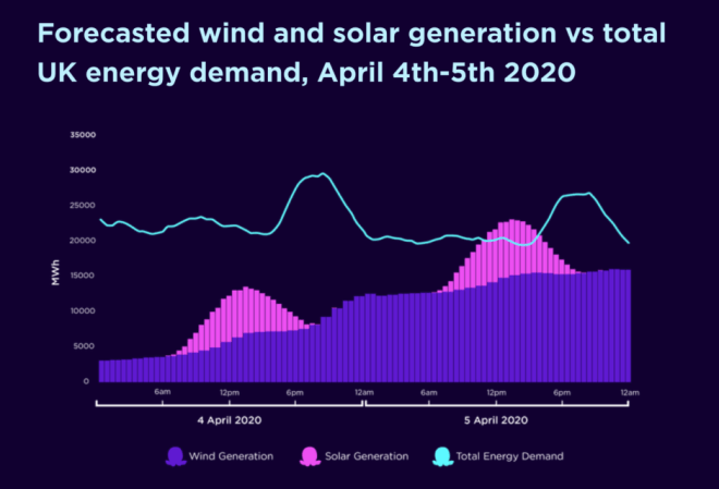 During lockdown, surges in renewables occasionally exceeded demand, yielding negative energy prices for those on flexible tariffs. Source: Octopus