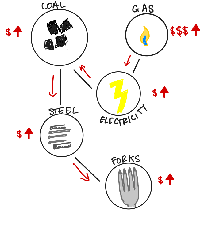 We now have a problem, because gas was one of the two ways we had to make electricity. As a result the price of coal, a substitute for gas in electricity production, increases in turn. This directly impacts the cost of steel, and ultimately forks. Even though in this example fork manufacturers have no direct dependence upon gas, the knowledge of the gas price increase has percolated through the economy and is now reflected in a slight increase in the price of forks.