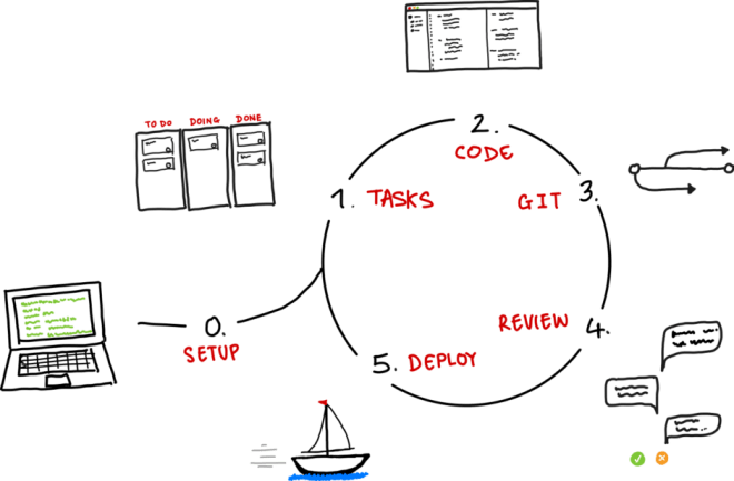 A version control program such as Github (who have this weird octocat character as a mascot, pictured in the centre) allows multiple developers to develop independently, periodically updating the shared copy of the code that lives on the internet. Source: author.
