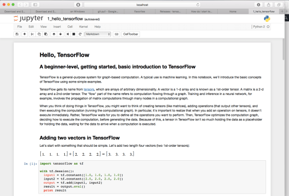 This is the interface for your Jupyter notebooks! Select one of them to get started (probably the one marked 1, hello_tensorflow), and you’ll see a real, live, Python notebook running Tensorflow: