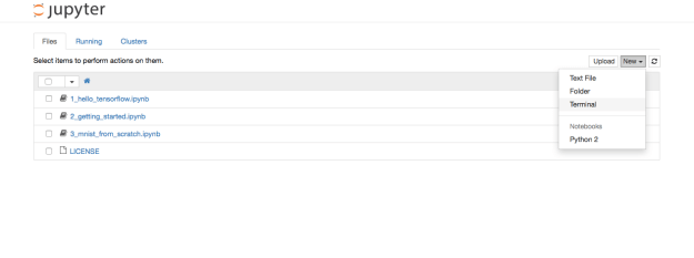 Helpful note from Julie Lee: If you don’t get the above notebook interface, it might be because your Jupyter notebooks aren’t being routed via port 8888. Try exiting your current Tensorflow instantiation (hit Ctrl-C twice) and running with the command