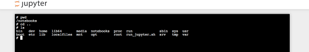 Once inside, we can use a unix command (pwd) to figure out where precisely we are. It turns out we are in a folder called notebooks.