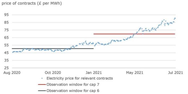 The price cap is calculated as a function of average wholesale prices. Pictured are the last two price caps: the next will be substantially higher. Note how the averaging is occurring across 6 month periods in which the price changes quite radically – refreshing the price cap more regularly would be a good way to reduce the likelihood of suppliers going bust. Source: Ofgem
